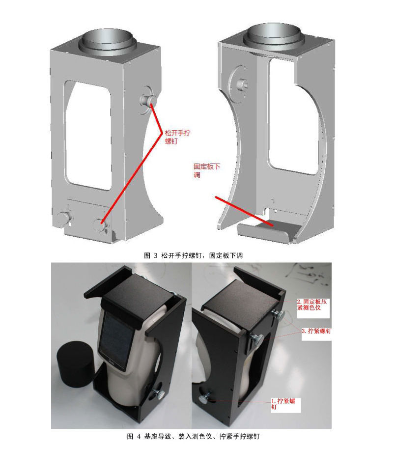 注意:確保測色儀固定穩固,確保測色儀測量口徑一側的台階麵緊貼黑腔底板的底麵。